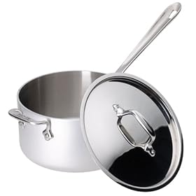 Brand & Type: All Clad 4.5 Quart MasterChef 2 Covered Saucepan with Lid Price range: High, around $165 Rating: High Description: All Clad 4.5 Quart MasterChef 2 Covered Saucepan with Lid Pros: Like all All-Clad products, this pot is made of great quality. Brushed Exterior. Cons: High Price. Conclusion: This is a beautiful pot, and at 4 1/2 quarts it is a very useful size. Even though All Clad makes very expensive kitchen cookware it lasts a lifetime. The helper handle on this model also makes it easier to use when you have it full of boiling water. Most cookware sets do not come with this size pot and you would have to spend something extra to get a pot like this.